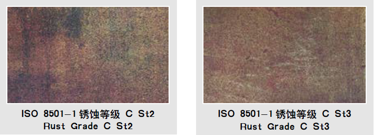 手工/動(dòng)力除銹等級(jí)對(duì)手工和動(dòng)力工具清理,例如刮、手工刷、機(jī)械刷和打磨等表面處理,用字母“St”表示。手工和動(dòng)力工具清理等級(jí)描述見(jiàn)表格。