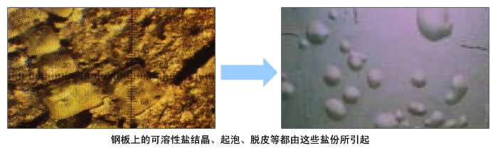 硫酸鐵、氯化亞鐵等可溶性鹽不僅直接破壞著涂層,引起滲壓起泡,附著力差等,它還是一種催化劑,會加劇腐蝕。除去可溶性鹽的最好方法進行高壓淡水沖洗,表面不平以及有縫隙的舊漆膜包括失效或海綿狀的防污漆膜內極易藏納鹽垢,更要仔細沖洗。