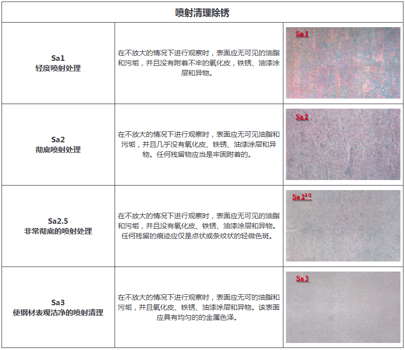 以噴射清理方式進行的表面預處理,以字母“Sa”表示。噴射清理前,任何厚的銹層應予鏟除,可見的油脂和污垢也應予清除。噴射清理后,表面應清除浮灰和碎屑。